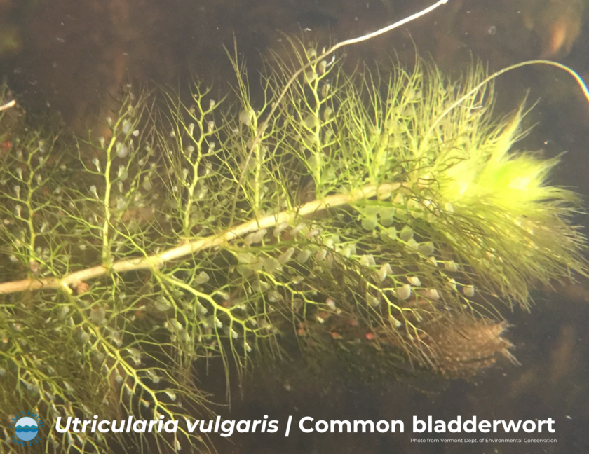 Common bladderwort (Utricularia vulgaris) is a carnivorous plant that lives submersed in the water and is native to Lake Champlain. Carnivory stretches our common perception of plants as peaceful photosynthesizers. This trait evolved in plants independently at least a dozen times, so bladderworts are not necessarily closely related to plants like the Venus flytrap. Unlike the two large leaves that form a “mouth” for the Venus flytrap, bladderwort leaves are interspersed with tiny sacs that trap and digest prey. The bladder trap, when "set", is under negative pressure in relation to its environment. The trap opens when hapless prey such as insect larvae or other minute aquatic organisms bump against the fine microscopic hairs around the bladder. This mechanically triggers the bladder to open and suck in water and whatever is floating in it. Once the bladder is full of water, the trap closes. The whole process from trigger to re-sealing the bladder takes about 10 milliseconds--100 times faster than a Venus flytrap--and water is sucked in at a remarkable force of 600 g (or 600 times the force of gravity). According to the Guinness Book of World Records, this makes the bladderwort the fastest plant in the world! Advances in microscopy and high-speed cameras have allowed researchers to study this surprisingly sophisticated trap system more closely. Recent findings suggest that bladderworts may form symbiotic relationships with microorganisms around their bladders, possibly to help attract prey and assist with digestion (much like our own gut flora!).