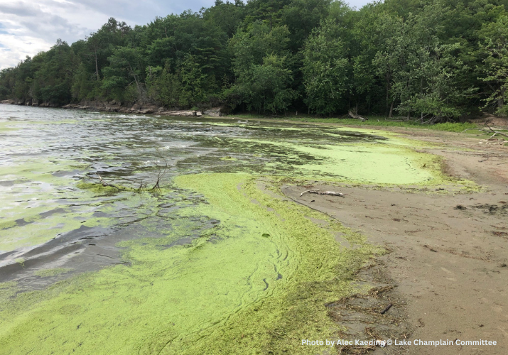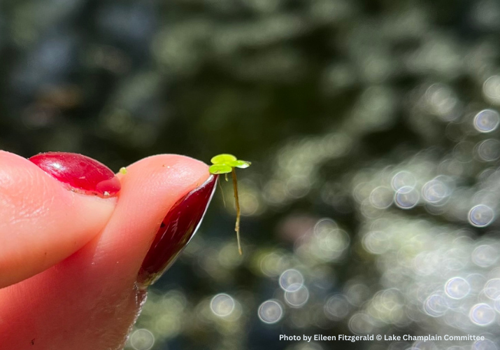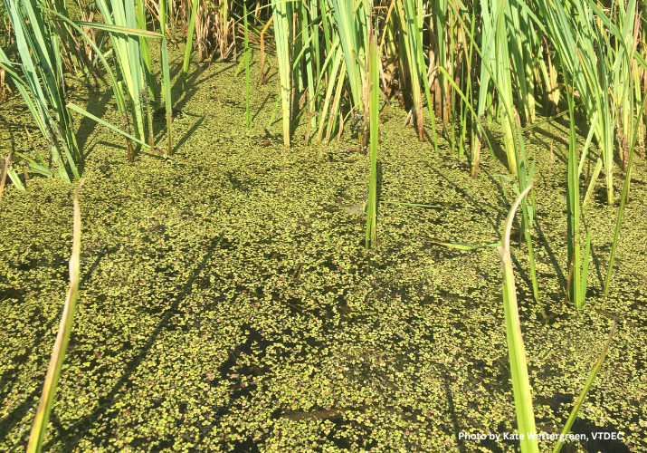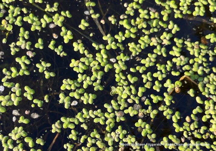 This little plant catches a lot of flack. Top internet search hits for the plant yield advice on eradication from ponds or aquariums. Indeed, though it is native to North America, duckweed is often mistakenly referred to as an invasive plant because of its rapid reproduction and ability to proliferate. While in some situations, duckweed might be considered a “nuisance” species, it is not invasive because it is native to Lake Champlain and surrounding waterbodies. Due to their size and their propensity to grow together in mats, they are also commonly mistaken for cyanobacteria blooms or algae. You need to get close to distinguish them: duckweed is made up of individual flattened floating leaves, while cyanobacteria have no leaves and are microscopic as individuals. They both like similar conditions: warm water, little wind or wave activity, and the key ingredients of nutrients—plenty of nitrogen and phosphorus.