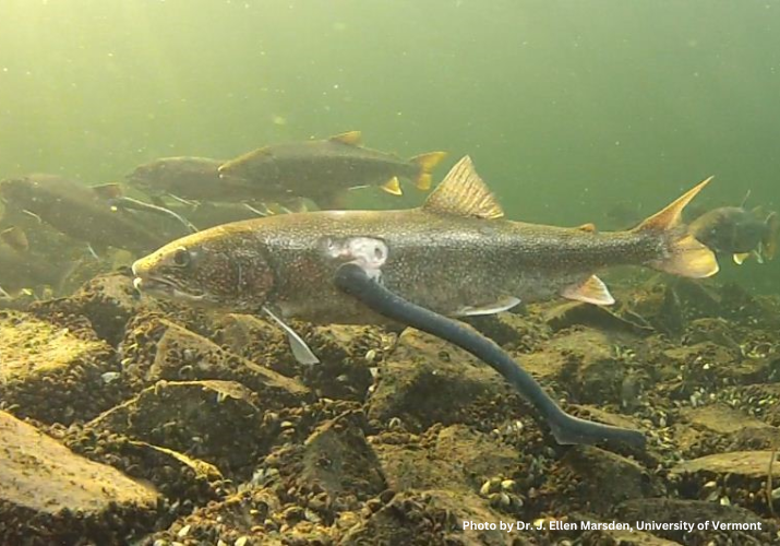 In the Great Lakes, lake trout populations crashed later, in the 1950s, which is what spurred restoration and stocking efforts. This crash, unlike the extirpation from Lake Champlain, was well documented: it was partially caused by the usual suspects of overfishing and degraded water quality, but was largely caused by sea lamprey (Petromyzon marinus). By most standards, sea lampreys are the stuff of nightmares: they are jawless parasitic fish that grow up to 24 inches long with smooth, scale-less skin. In its parasitic life stage, the juvenile sea lamprey will latch onto a host fish with its suction disk mouth filled with spiraling rows of small, razor sharp teeth. After puncturing the skin of their host, sea lamprey release an anticoagulant in their saliva that prevents blood from clotting while they feed. The host fish often dies from blood loss or infection—mortality rates are between 45% and 75%—and fish that survive sea lamprey attacks will have decreased success in survival and reproduction later on. Sea lamprey love lake trout because of their thin skin and small scales which makes for an easy meal. Long referenced as an invasive species because of a lack of historical record in Lake Champlain, more recent studies suggest that sea lamprey may be native to Lake Champlain as a leftover from the last ice age. Genetic studies also strongly suggest that sea lampreys are native to Lake Ontario and the Finger Lakes, so theories of spread to Lake Champlain through the inland canal system have also been proposed. While it is possible that sea lamprey were present in Lake Champlain well before lake trout extirpation, their populations still skyrocketed in the 20th century to the detriment of sea lamprey hosts like lake trout.