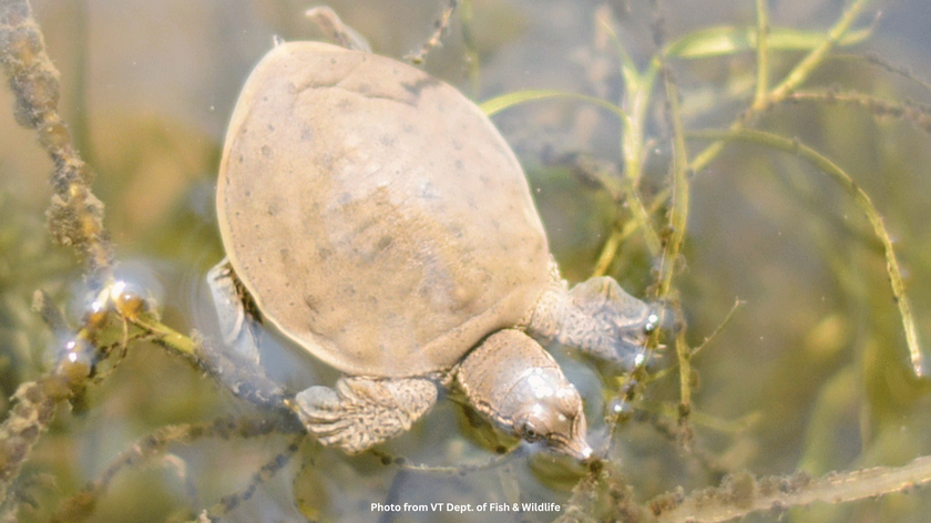 The spiny softshell turtle—a designated rare and endangered species in both New York and Vermont—lacks this mineral reserve, as its shell is flattened and covered in leathery skin rather than bony plates. They must obtain oxygen solely by breathing through their skin in a process called cutaneous respiration. They absorb oxygen through the lining of the mouth (where uptake is most efficient), the legs, and the cloaca—turtle analog to the anus. Spiny softshell turtles must hibernate in areas where oxygen is available in the water throughout the season, so they often choose the same hibernation spots year after year that lack ice scour. They nestle in shallow muck within neck-reach of the water.