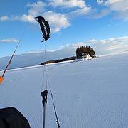 Throughout the winter, Lake Champlain’s vast tracts of ice and snow provide the perfect conditions for snowkiters like Gary Kjelleren. A brand-new sport in the late 1990s, kitesailing (the summer version of snowkiting) quickly took off in popularity. A kitesailer uses a large sail-like kite to catch the wind, while they skim and jump over the water’s surface on a finned water board. Anyone who has spent time on the shores of a large lake or ocean is likely familiar with the colorful, crescent-shaped kites that swoop jauntily through the air, a small human figure skipping along behind them.
