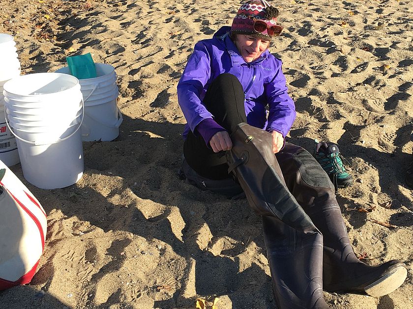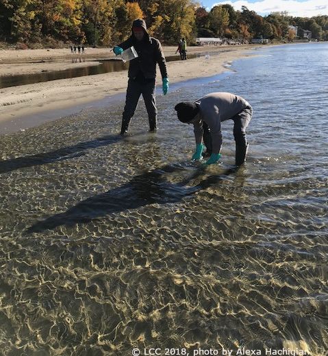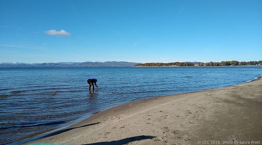 It was a sunny, crisp October morning. The rainy grey mist from the week before had cleared to reveal a stunning panorama of mountains, lake, and sand. On a beach just north of Burlington a group of volunteers, bundled in warm layers against the morning chill, were ranged in a staggered line. Those with muck boots waded through the shallow water, while the others walked along the shoreline. Every few paces each stopped to kneel and scoop up sand in a small steel sieve. They then shook away the sand, as if panning for gold, examined the contents briefly – and discarded them.