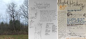 An example of a sit spot in a Charlotte, VT backyard, where the observer chose to focus on an area surrounding a shagbark hickory tree. Interact with your sit spot in a way that resonates with you: sit peacefully, sketch, or jot down notes. Images by Lauren Sopher.
