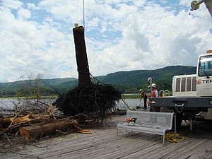 The Albany Times Union reported that this year’s lake flooding has led to some navigational challenges in the South Lake. Portions of the shoreline have broken off creating ‘islands’ as large as half an acre within navigation channels. In mid-July, the US Army Corps of Engineers used a floating crane to remove trees boulders and other debris from the lake at Maple Bend in Dresden; the result of a landslide reported on July 6th. Additional large segments of shoreline broke free and started floating in South Bay. According to Dave Winchell of the New York Department of Environmental Conservation, the largest of these segments has come to rest against a jetty leading to the South Bay fishing pier, while it is unclear what happened to the other pieces.