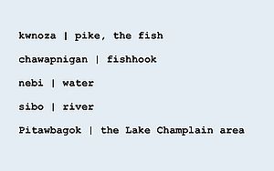 Water-related Abenaki words from the free language teaching website WesternAbenaki.com, created by Jesse Bowman Bruchac. Image by Lake Champlain Committee.