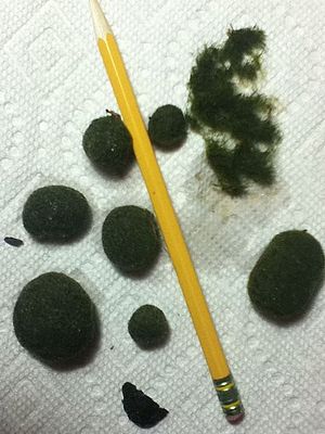 Marimo is a growth form of the species Aegagropila Linnaei. The genus name is Greek for goat hair, and the balls did resemble clumped mats of coarse hair. Other common names include lake rollers, moss balls, and lake goblins. The species has three different growth forms: mats that grow on rocks, free-floating fragments, and the balls that were sent to LCC. In at least one lake the balls grow close to shore while mats grow in deeper water. The free-floating forms serve as a means for the species to spread, as sexual reproduction is quite rare.