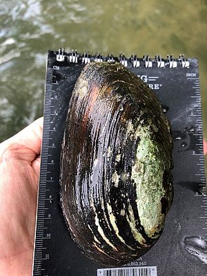 Eastern elipptio, a species of freshwater mussel native to VT & NY taken during LCC fieldwork to assess population health. Photo by Lauren Sopher.