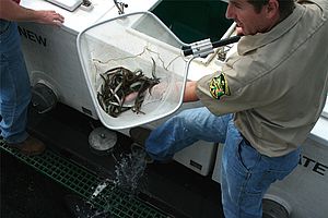 Transferring muskie to the Lake. Photo by Tom Wiggins, Vermont Fish & Wildlife Dept.
