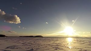Surprisingly, an ice layer can keep the lake warmer. Water freezes at 0°C but is most dense at 4°C. So when the lake reaches 4°C it continues to cool even if it hasn’t quite frozen. However, an ice layer over the top of the lake insulates it and the water beneath the ice remains above 0°C. While the water closest to the surface will be near 0°C, the deeper waters might be a few degrees warmer.