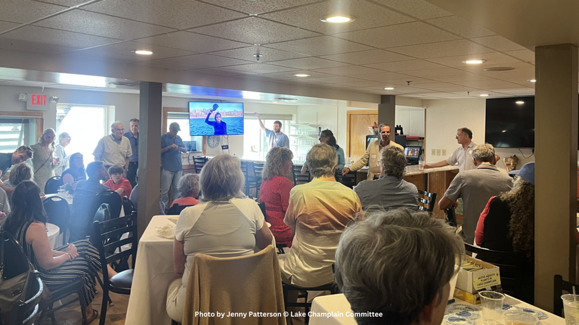 Around 80 people gathered over drinks, tapas, and desserts to honor the depth and breadth of Lori’s contributions to Lake Champlain. Attendees recalled her tireless efforts to advance clean water policies—from reducing nutrient pollution and banning harmful toxins, to protecting wetlands and securing long-term funding for water quality. Laughter filled the room as guests recounted Lori’s ability to make stewardship engaging—rallying family and friends to spend birthdays pulling invasive plants and launching quirky, impactful outreach campaigns like April Stools’ Day, which used humor to spotlight the issue of pet waste and water quality.