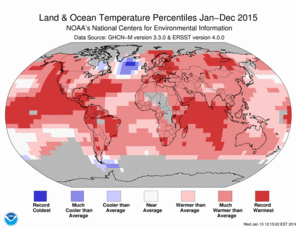 Some records endure the test of time. The world record for the fastest mile has stood for 17 years. The largest smallmouth bass from Lake Champlain was caught in 1978. Records for the hottest year on the planet on the other hand, don’t seem to last very long. Last year, 2015, set the new record for hottest year ever recorded, eclipsing the previous record which had been set just one year earlier. NASA reported that 2015 was officially 0.23 degrees Fahrenheit (0.13 degrees Celsius) hotter than 2014, a sharp increase for a record in which annual variation is normally measured in the hundredths of a degree.